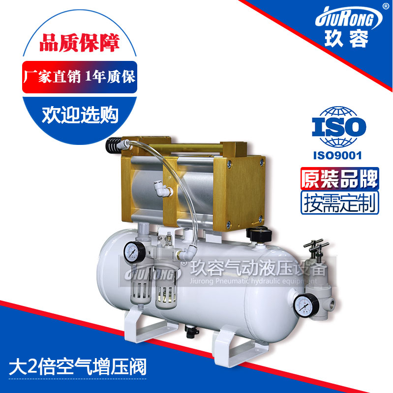 大2倍空氣增壓閥JRN-C-L2B-E型是以壓縮空氣為動力源的一種帶灌的活塞式增壓泵,當進氣時空氣增壓泵的泵芯往復切換工作,控制增壓泵活塞以極快的速度作往復動作,隨著輸出壓力的增高,活塞的往復速度減慢直至停止,此時,空氣增壓泵輸出的壓力恒定,能量消耗最低,各部件停止工作;無論何種原因造成保壓回路壓力下降,空氣增壓泵將自動啟動,補充泄露壓力,保持回路壓力恒定。
